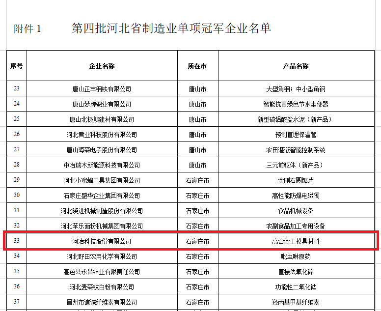 近日,河北省工業(yè)和信息化廳發(fā)布《關(guān)于公布第四批河北省制造業(yè)單項冠軍企業(yè)名單的通知 冀制強省辦〔202225號》。經(jīng)企業(yè)申報、各市工信部門推薦、專家評審、現(xiàn)場抽查、公示,確定了河北省第四批制造業(yè)單項冠軍企業(yè)(產(chǎn)品)名單,通過公示期,河冶科技股份有限公司獲得河北省單項冠軍企業(yè)認定。