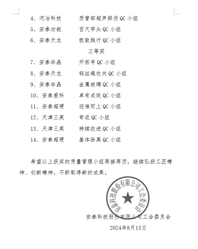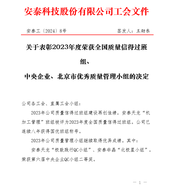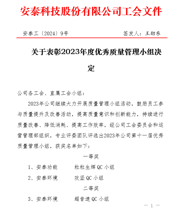 公司獲評(píng)2023年度安泰科技優(yōu)秀質(zhì)量管理小組