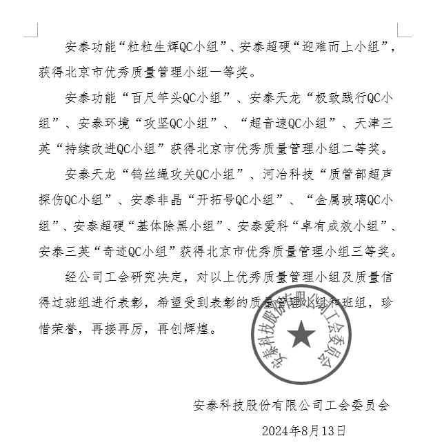 為鼓勵(lì)員工參與質(zhì)量提升及改善活動(dòng),提高質(zhì)量意識(shí)和創(chuàng)新能力,持續(xù)進(jìn)行質(zhì)量改善、降低消耗、提高工作效率,河冶科技-質(zhì)管部超聲探傷QC小組榮獲中央企業(yè)、北京市優(yōu)秀質(zhì)量管理小組三等獎(jiǎng), 2023年安泰科技第十一屆優(yōu)秀質(zhì)量管理小組二等獎(jiǎng)。